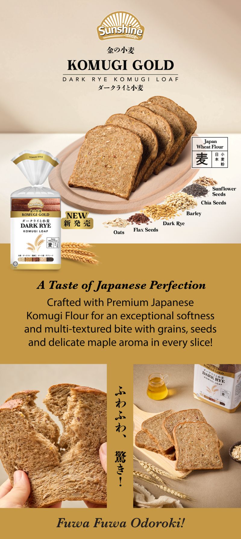 Introducing our first premium wholemeal loaf range, the Sunshine KOMUGI GOLD, crafted with premium Japanese Komugi flour, offering an exceptionally soft bite and refined layers of taste and texture in every slice.